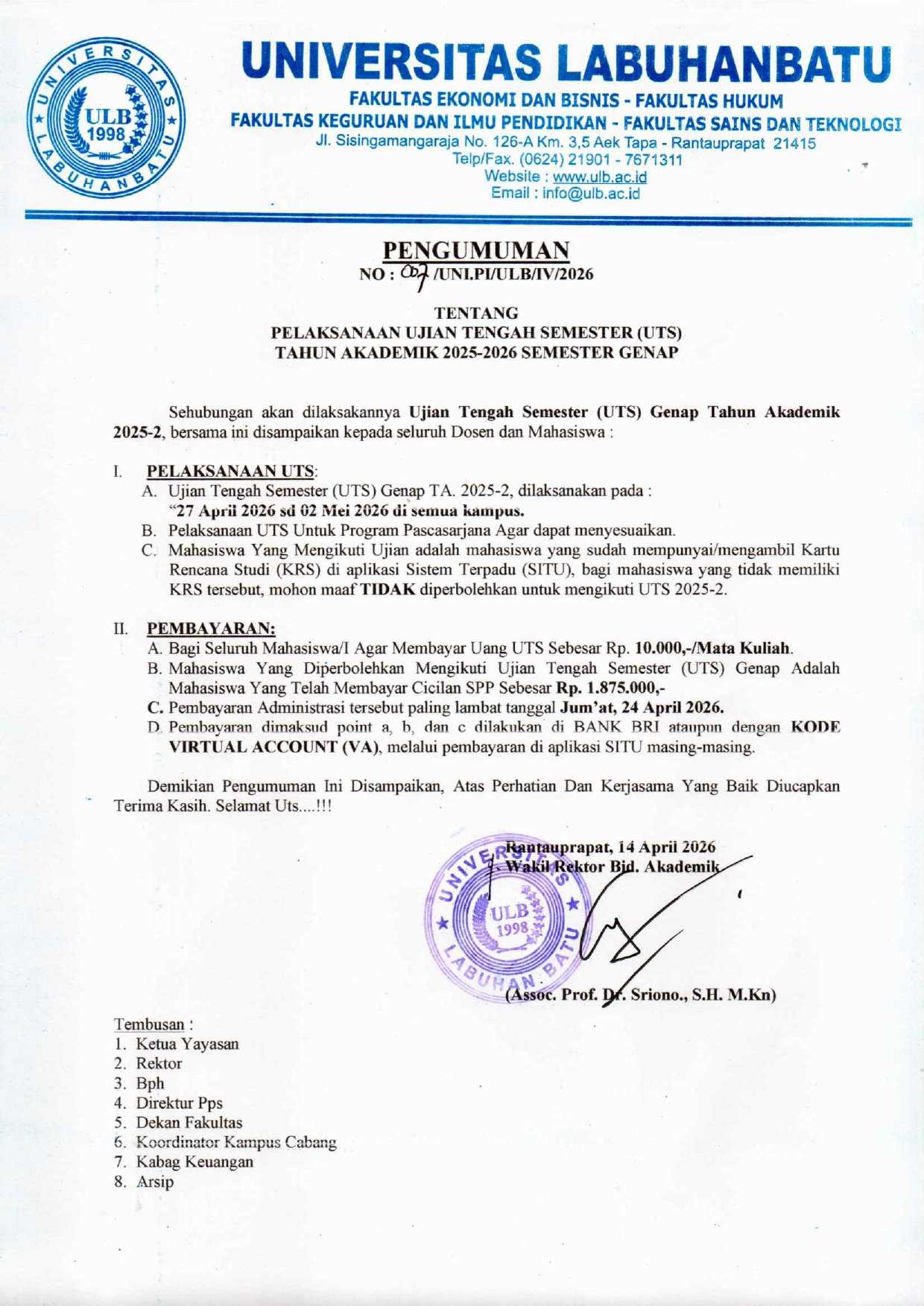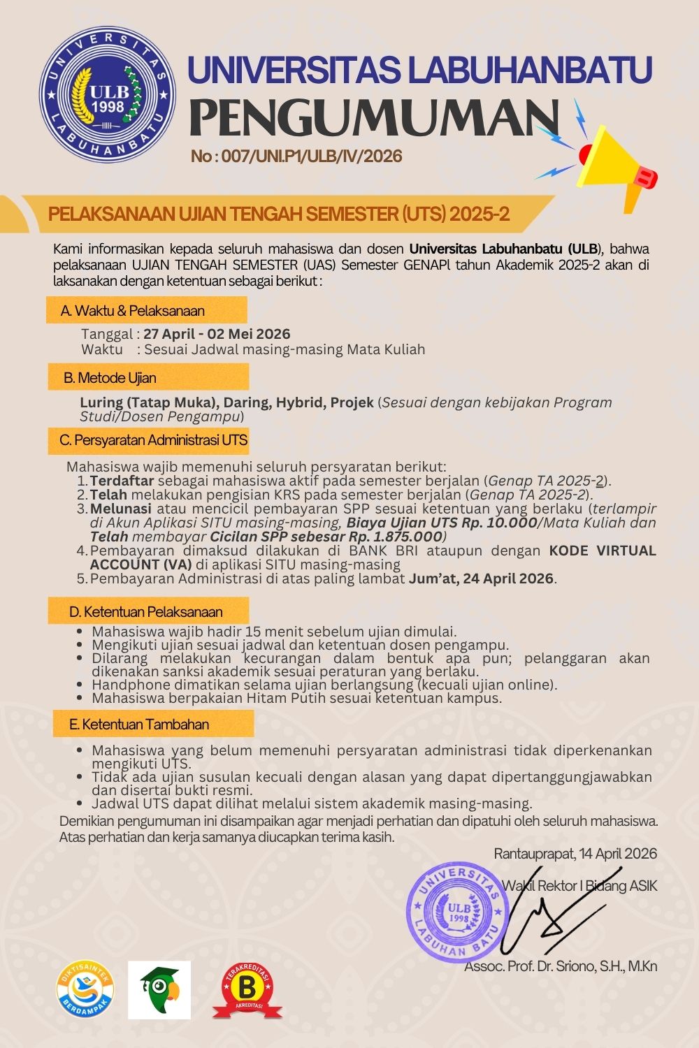 Diberitahukan kepada seluruh mahasiswa/i Fkip Universitas Labuhanbatu bahwa pelaksanaan Ujian Tengah Semester (UTS) akan diselenggarakan sesuai dengan ketentuan berikut: